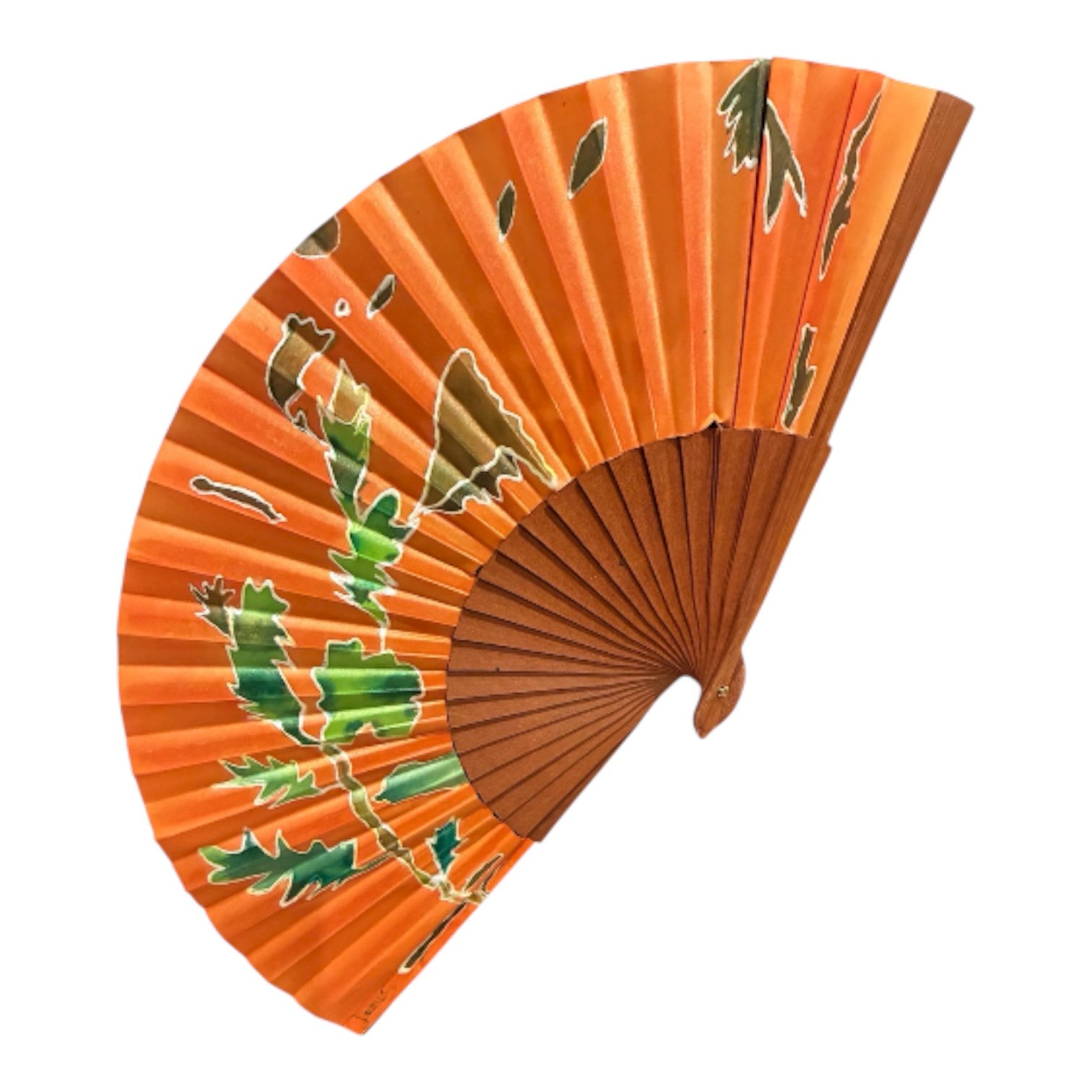 Abanico de seda natural pintado a mano, en un proceso totalmente artesanal, se puede personalizar color y hacer pañuelo de seda natural a juego con el abanico bajo pedido por encargo, Medidas 21 cm. ComposiciĂ³n; Pais de seda natural, varillas de madera de peral pulido-