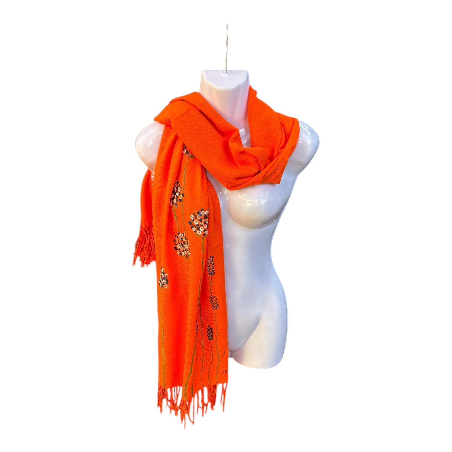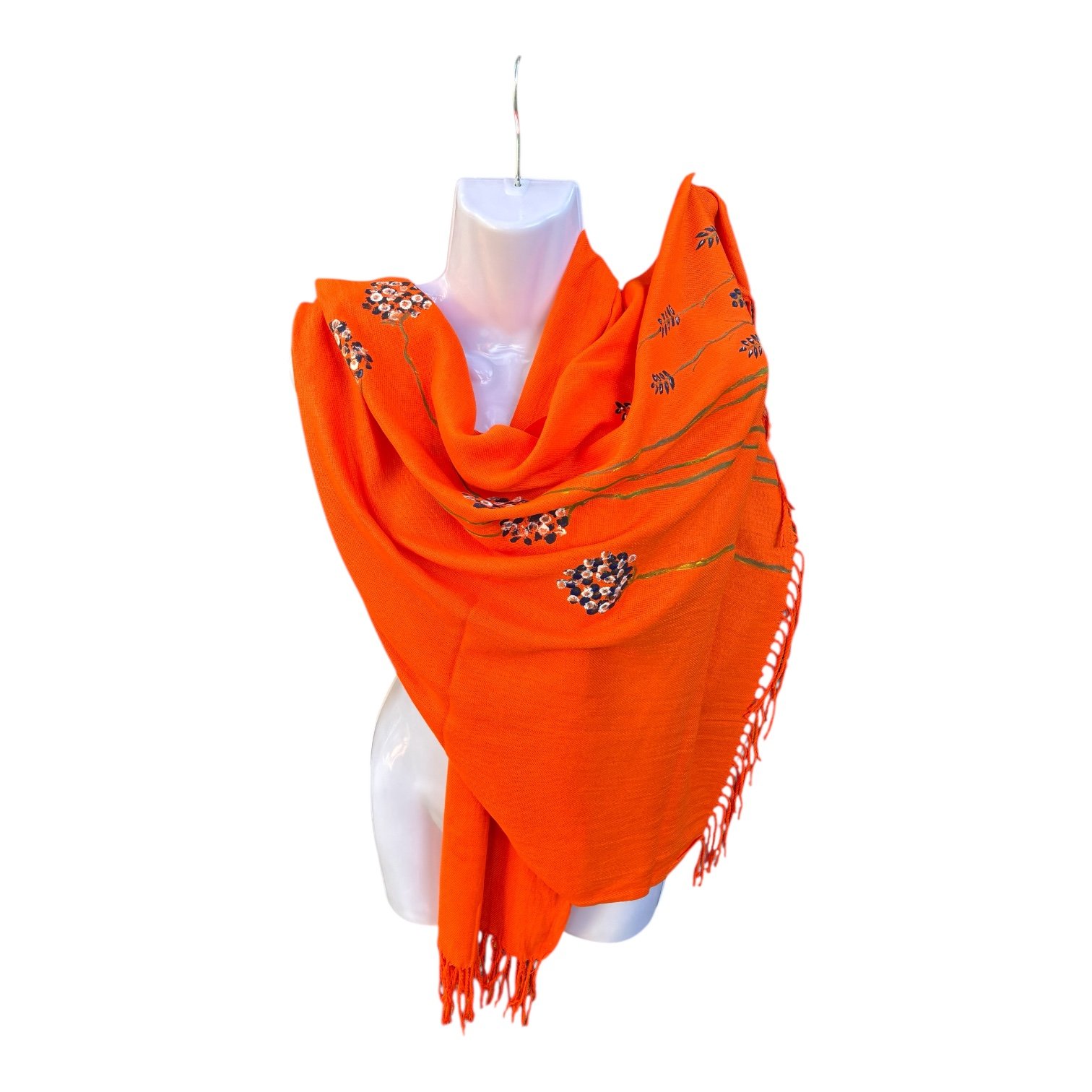 Bufanda/chal naranja pinintada a mano en un proceso totalmente artesanal, exclusiva, muy suave, ligera y de gran capacidad de aislamiento tĂ©rmico. Medidas: 180 x 70cm. ComposiciĂ³n: Acrilico 100%