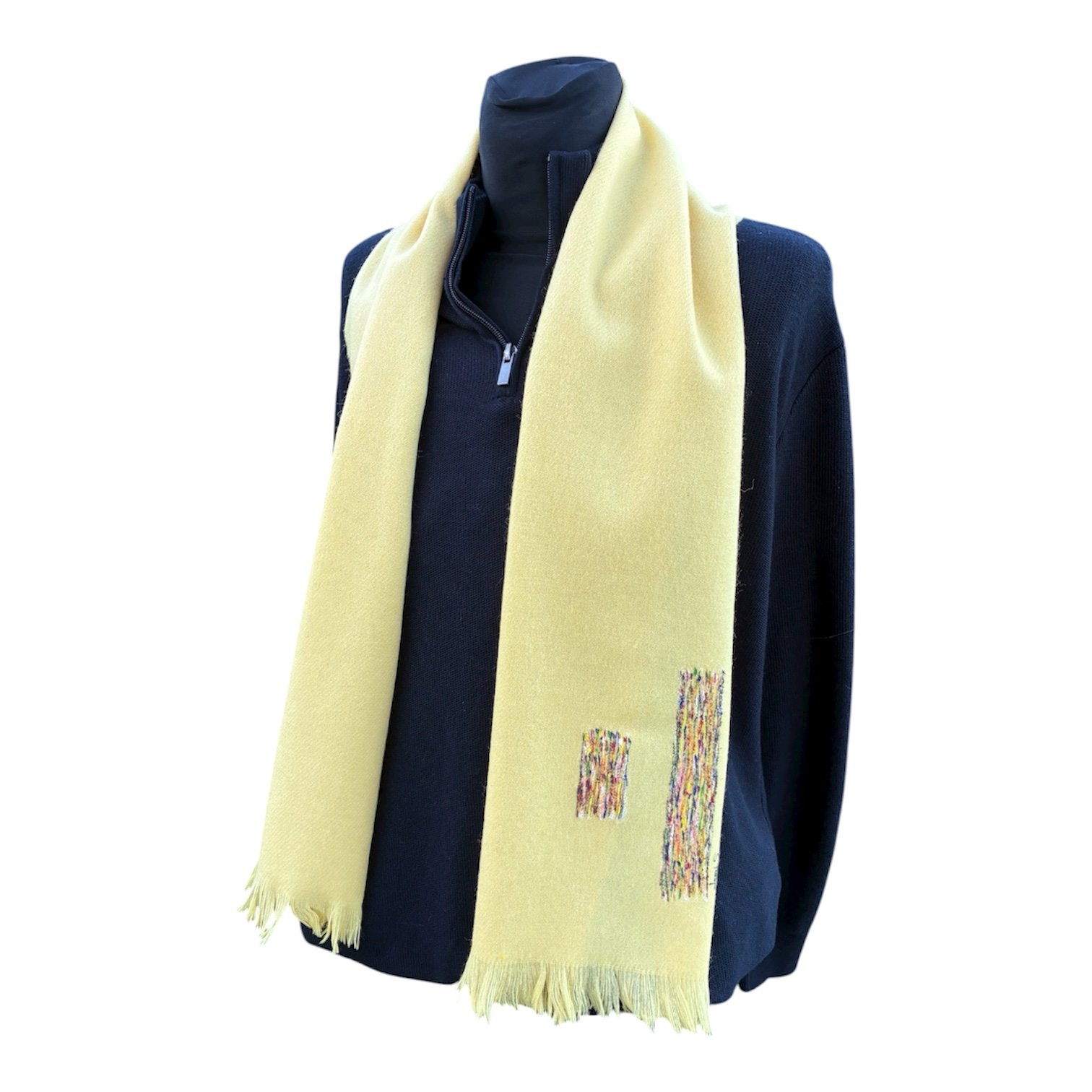 Bufanda amarilla de lana escocesa pintada a mano. Medida: 140 x 30 cm. ComposiciĂ³n: Lana escocesa 100%