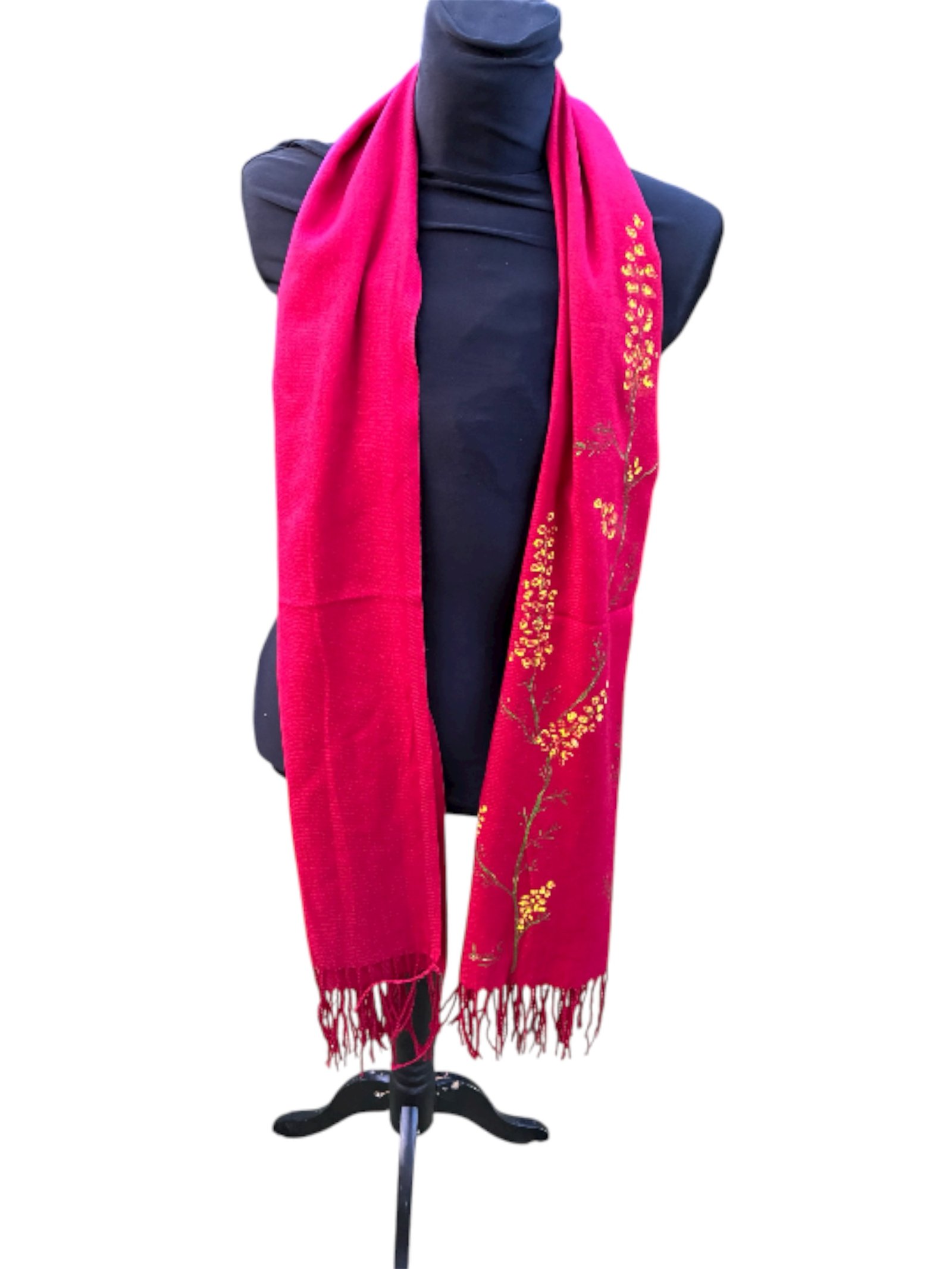 Bufanda granate con ramaje de mimosa pintada a mano en un proceso totalmente artesanal, muy suave, ligera y de gran capacidad de aislamiento tĂ©rmico. Medidas 180 x 70 cm. ComposiciĂ³n: AcrĂlico 100%