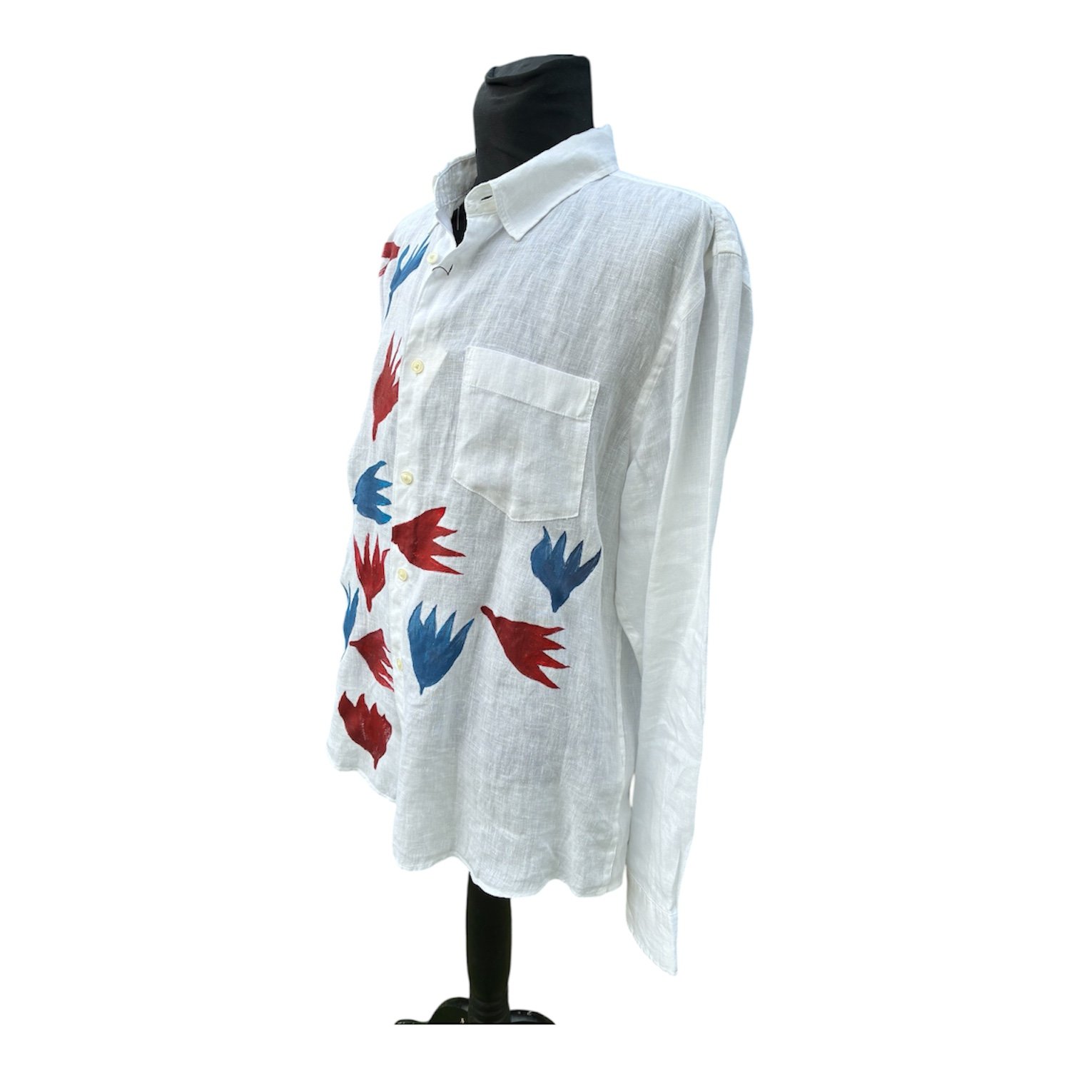 Camisa de lino blanca con dibujo azul y rojo pintada a mano