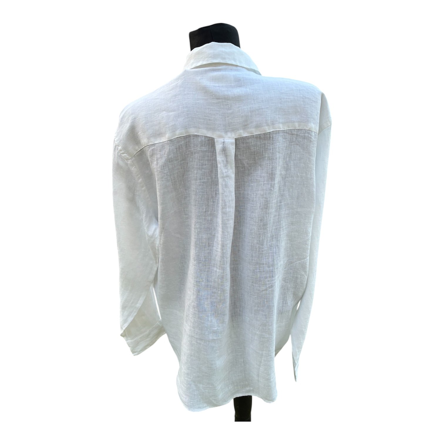 Camisa blanca de lino, con hoja pintada a mano con un proceso totalmente artesanal, cuello solapa, manga larga acabada en puño con botones, pliegue en espalda, bolsillo delantero corte tradicional y contorno recto. Al ser un tejido 100% natural está indicado para personas con piel sensible.. Medidas: Pecho 63 cm. Espalda 50 cm. Largo delantero 79 cm. Largo manga 70 cm. Composición: Lino 100%