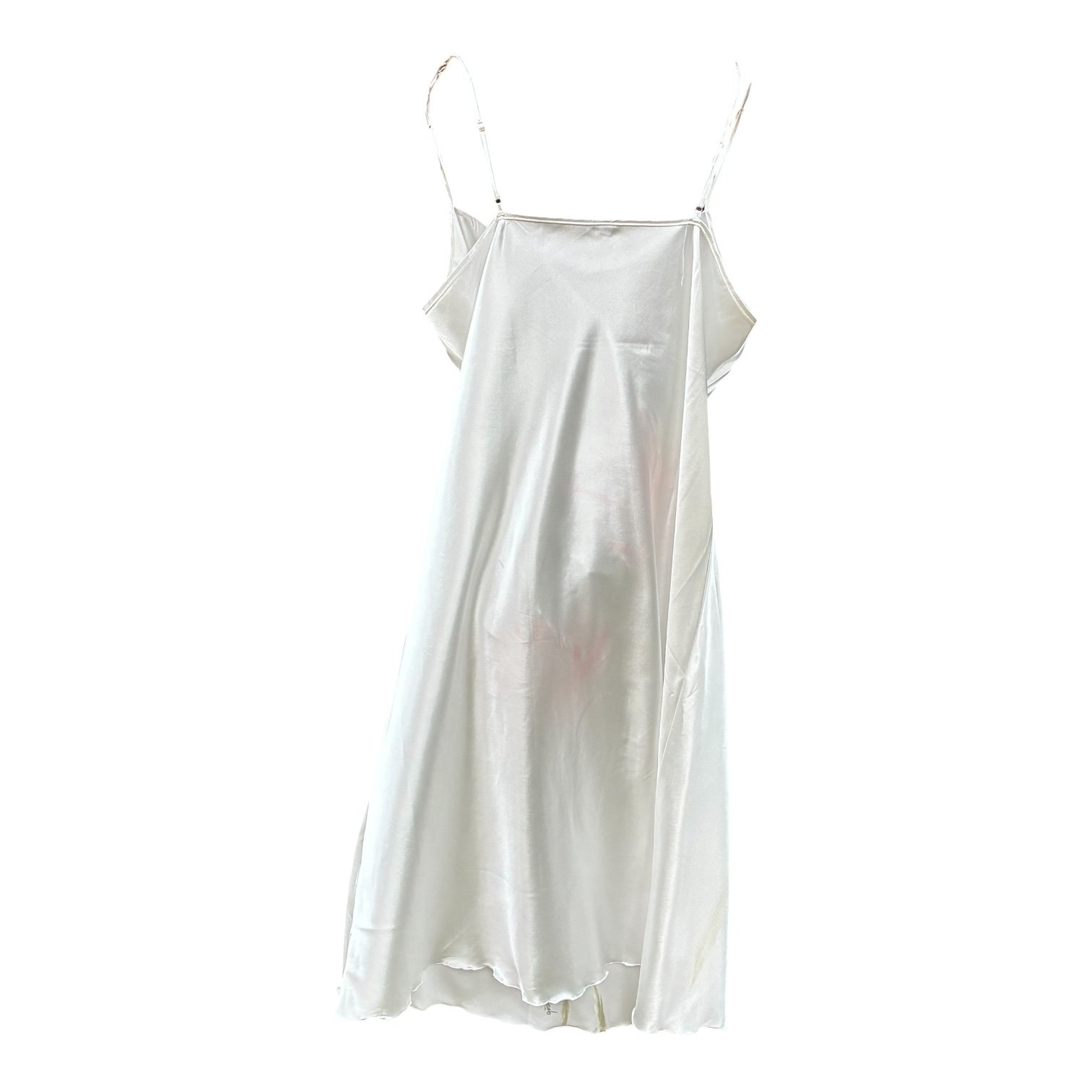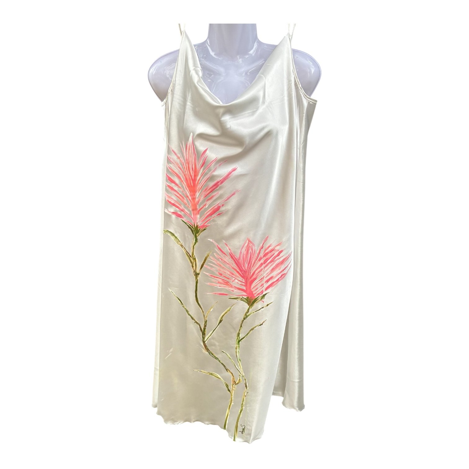 Camisión de satén blanco, pintado a mano con un proceso totalmente artesanal, brindando una sensación de confort con su suavidad y brillo elegante, con tirantes finos ajustable, escote pañuelo. Muy cómodo. Composición: Poliester 100%