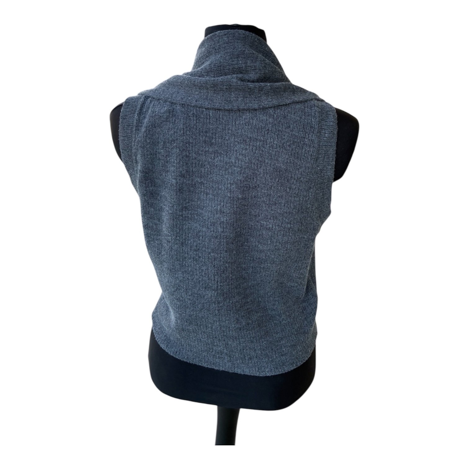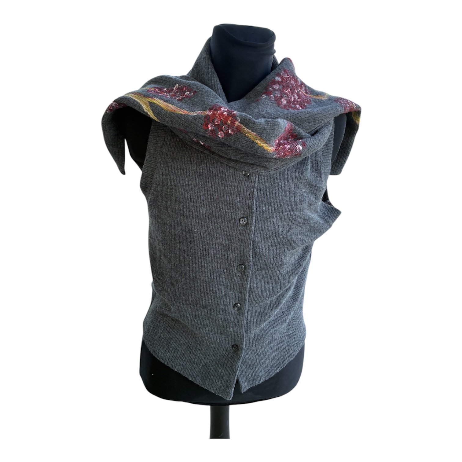 Chaleco gris con fular pintado a mano, cierre frontal con botones. Medidas: Pecho 50 cm. Largo delantero 46 cm. ComposiciĂ³n: AlgodĂ³n 50% Poliester 50%