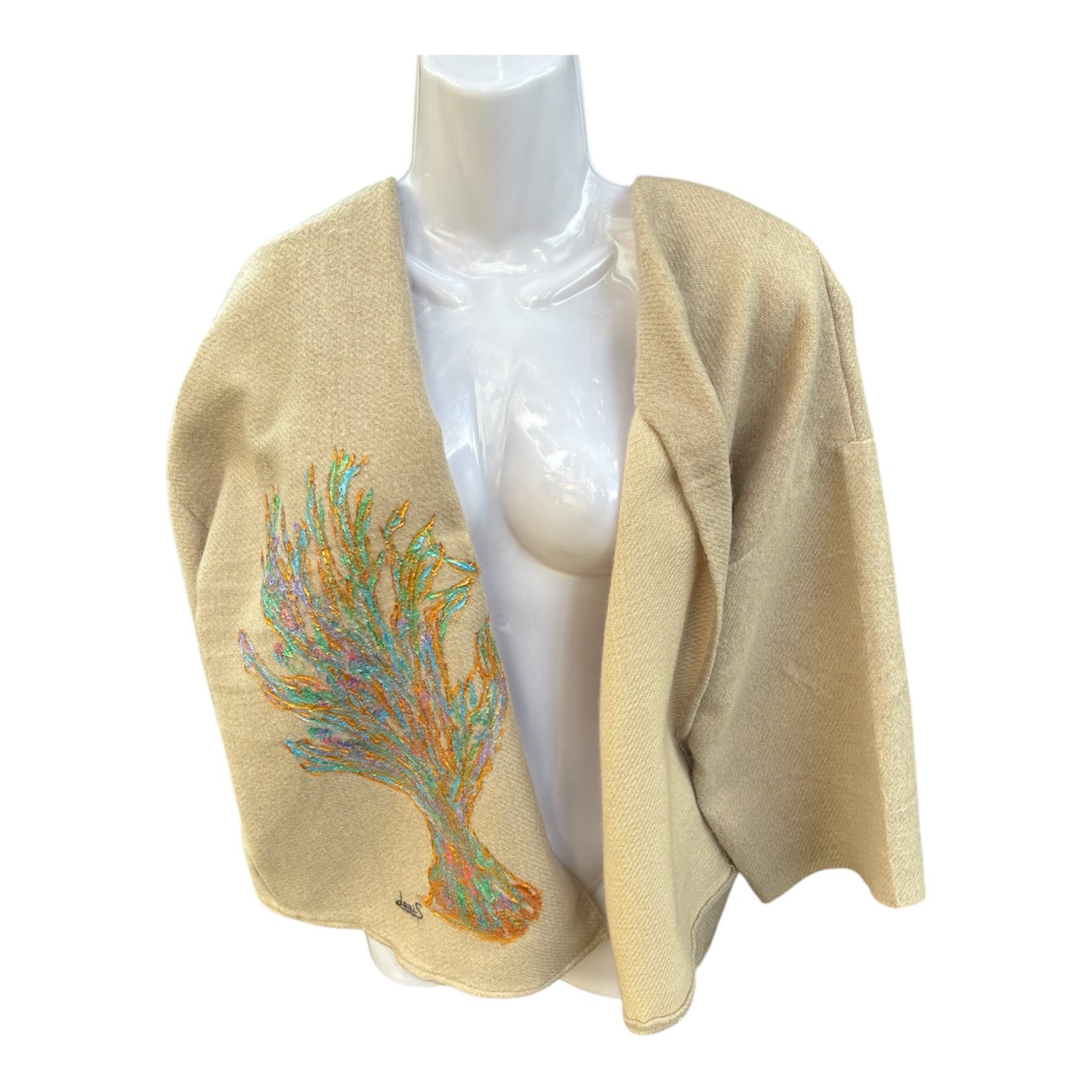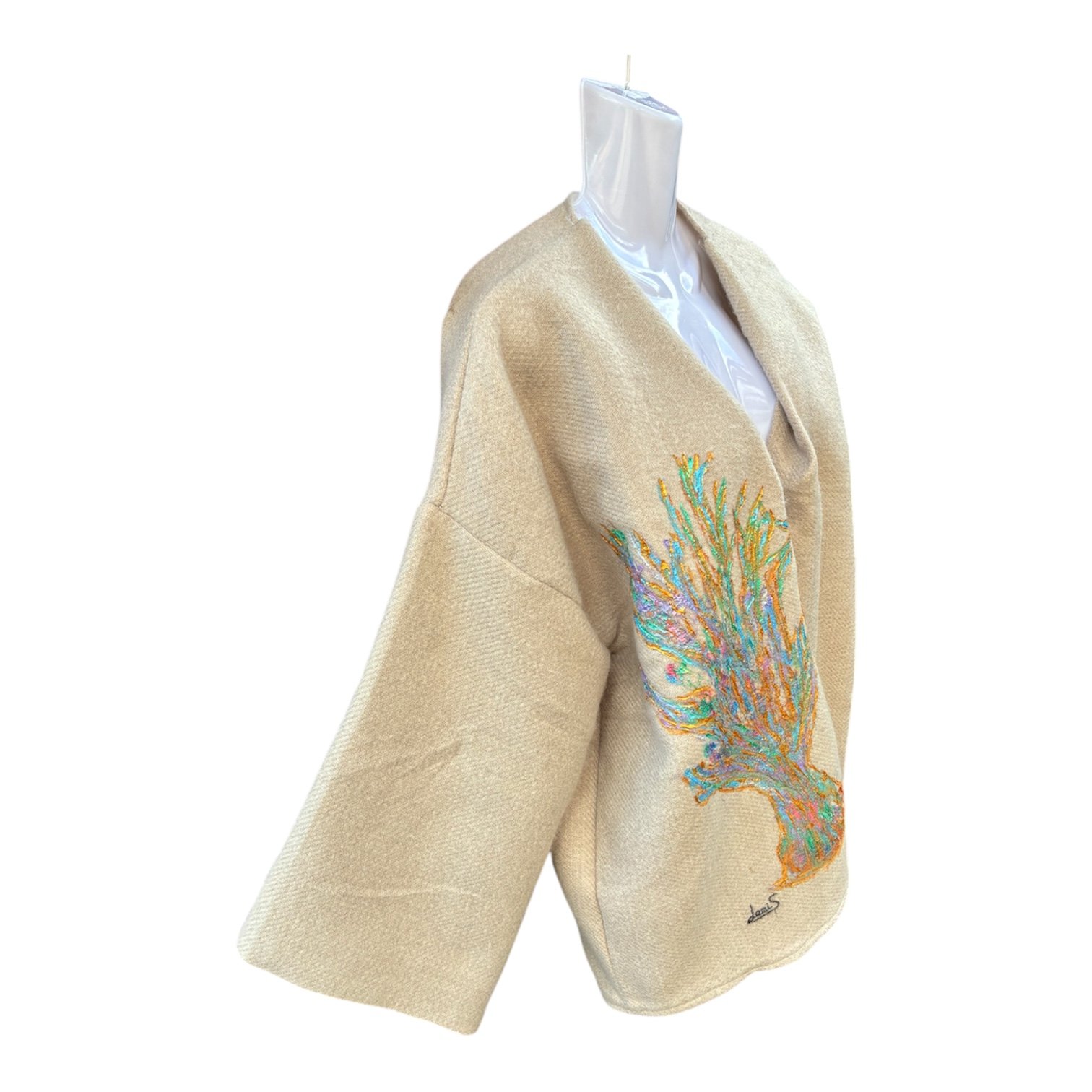 Chaqueta beis/gris, pintada a mano con un proceso totalmente artesanal, manga francesa, cierre sin botones, muy cĂ³moda