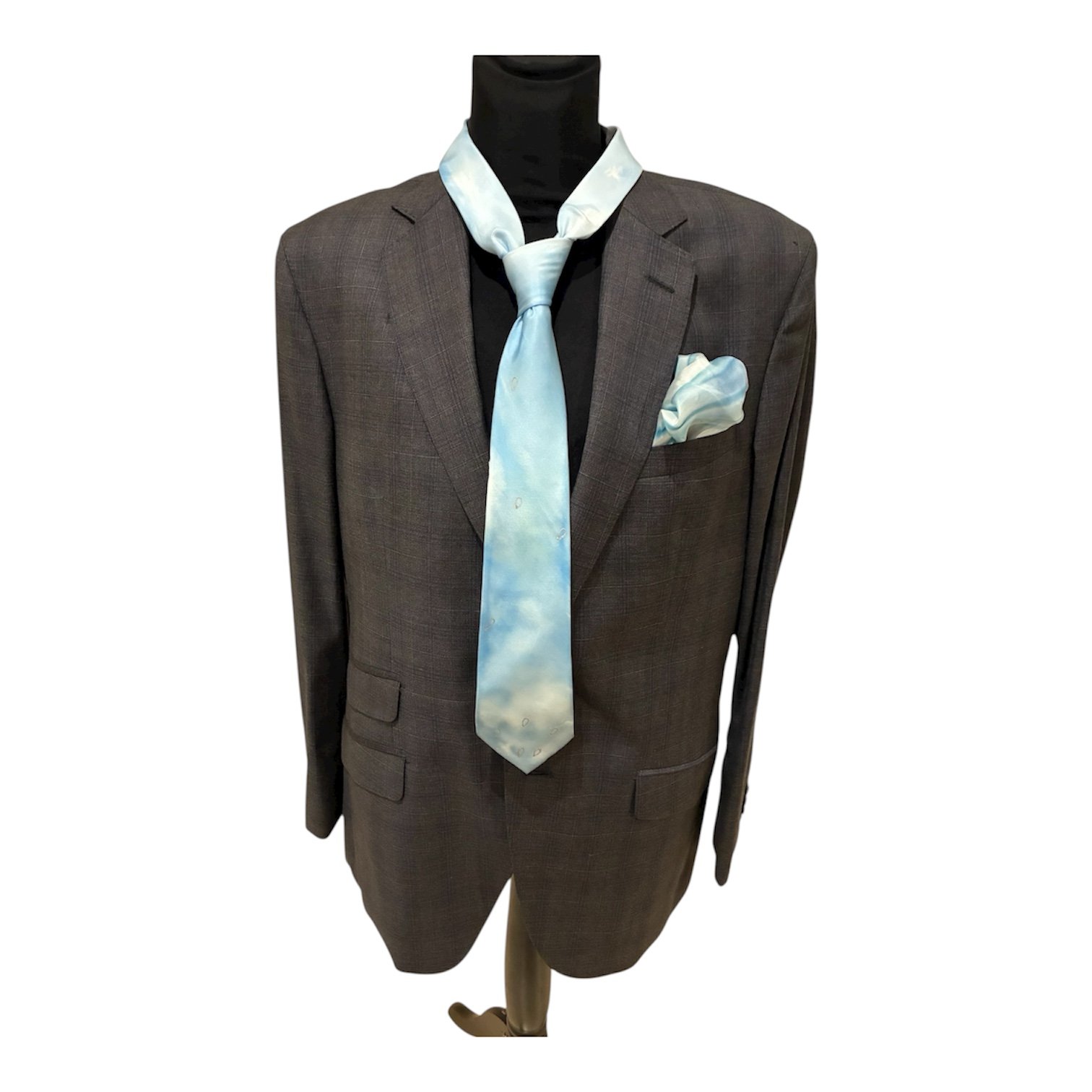 Conjunto de corbata y pañuelo bolsillo en seda natural 100%, simula nubes en tonos azul claro, blanco, gris y gotas plateadas, pintada y cosida a mano en un proceso totalmente artesanal de principio a fin, acolchada con entretela de lana para una caída sutil y consistente. Se puede diseñar en cualquier color por encargo. Medidas: Corbata 142 x 7,5 cm. Composición: seda natural 100% crepé.