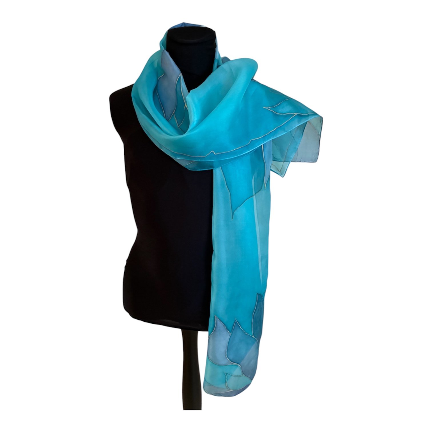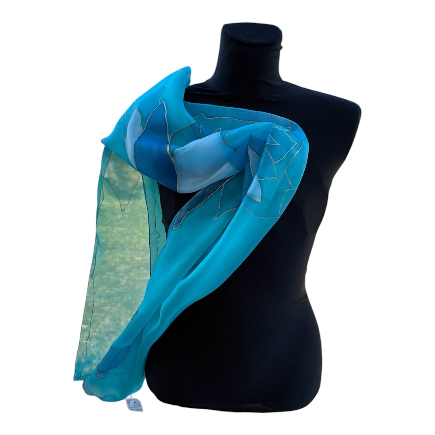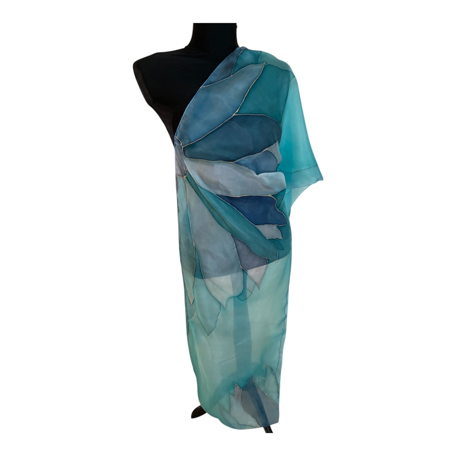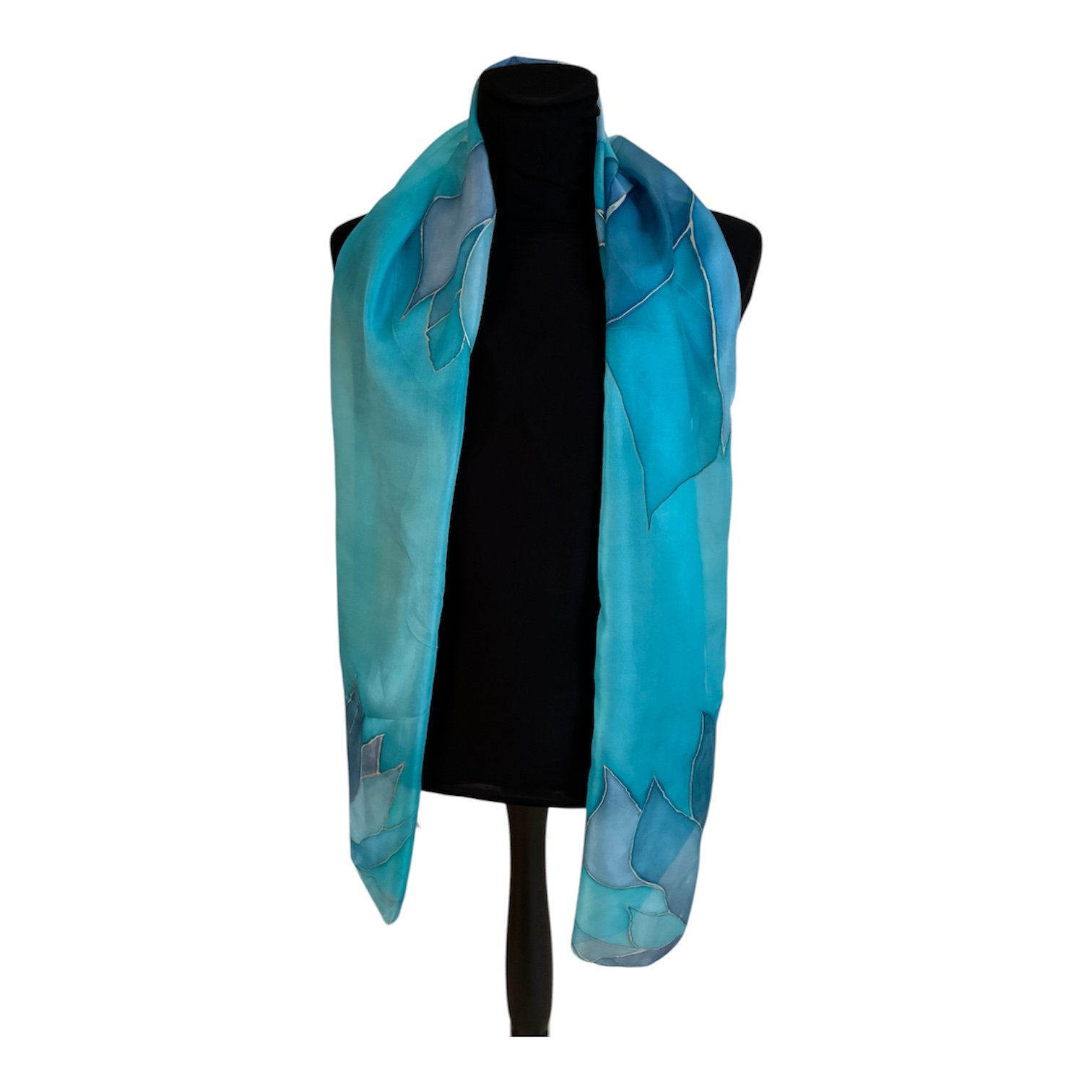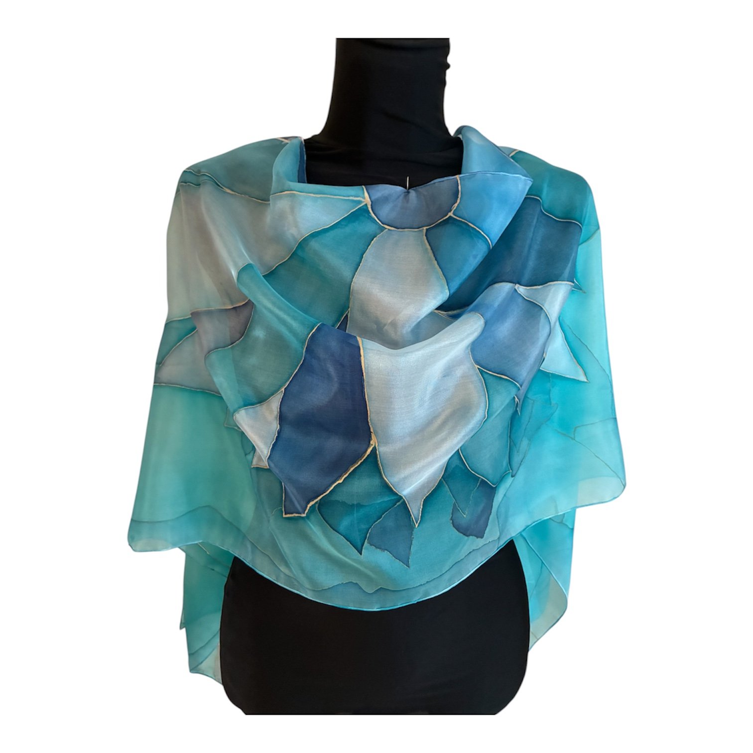 Conjunto fular y abanico de seda pintado a mano con flor en distintos tonos azules realizado en un proceso totalmente artesanal. Se puede personalizar en cualquier color y medida por encargo.