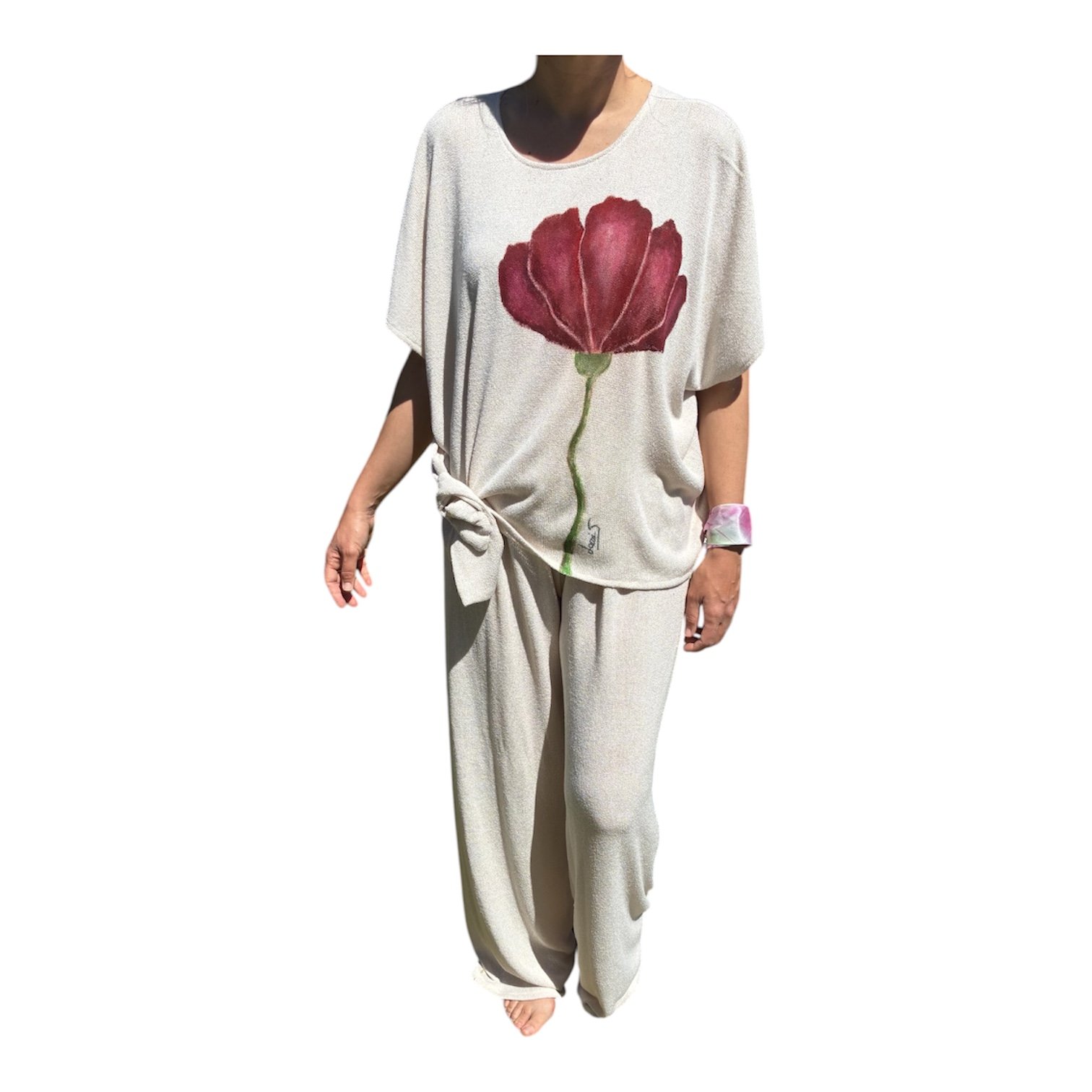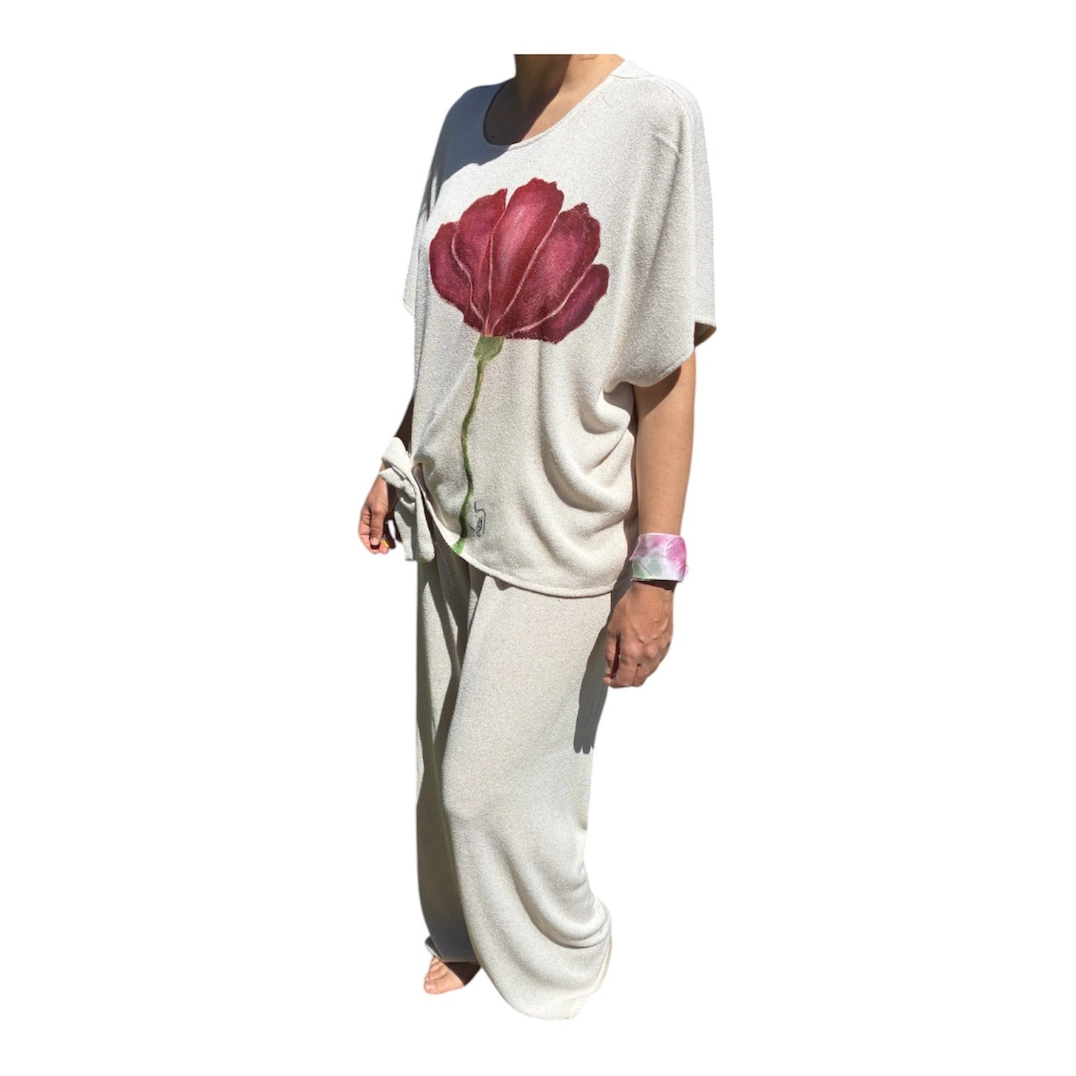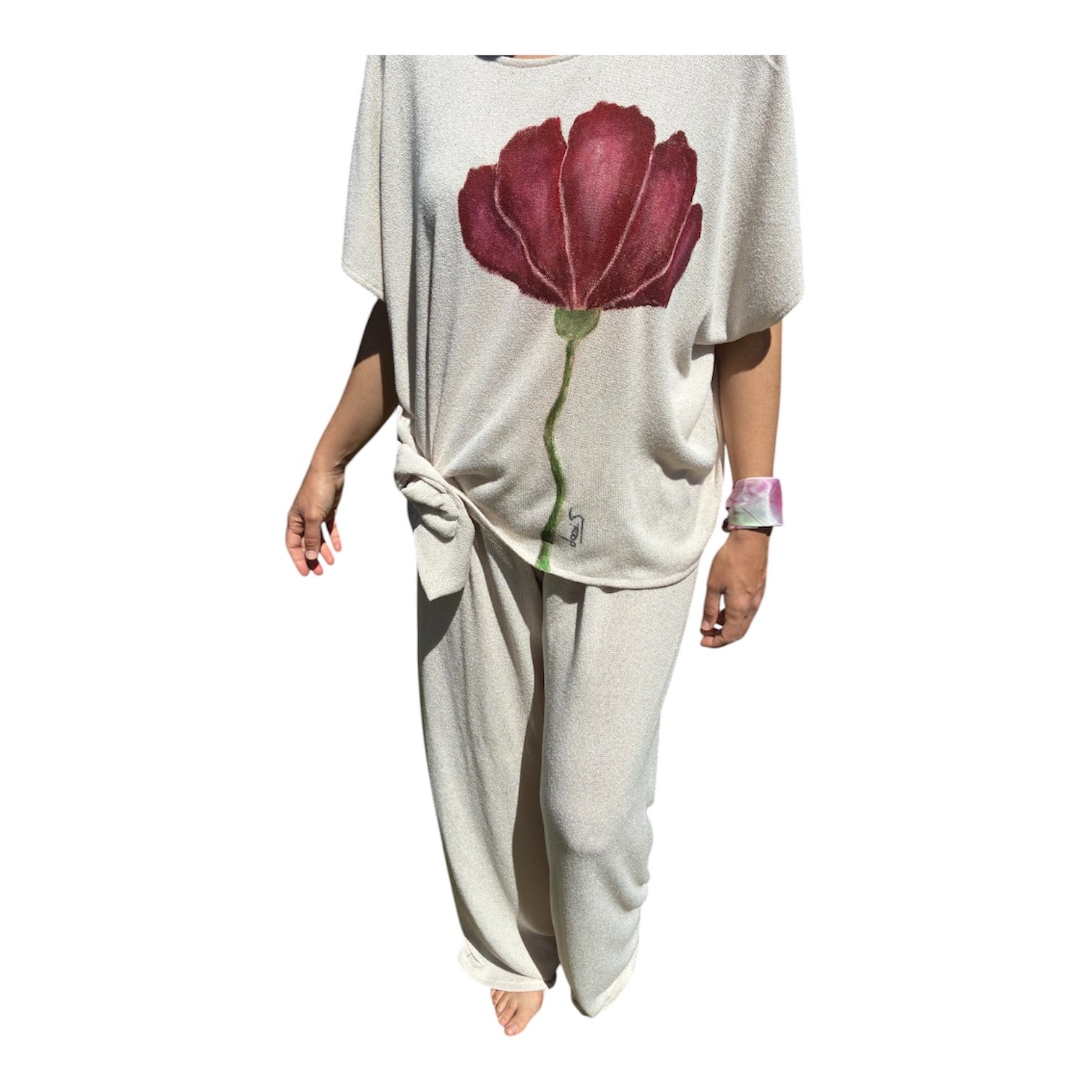 Conjunto de jersey oversize y pantalón  de punto pintado a mano, jersey amplio ajustable con broche,  cuello redondo con  bufanda, manga corta, pantalón ancho muy cómodo