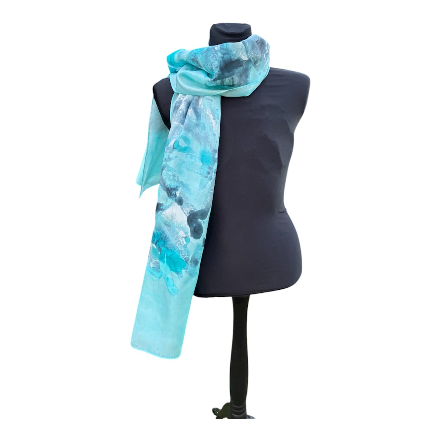 Fular de seda natural en distintos tonos azules pintado a mano con un proceso totalmente artesanal, el orillado a mano con hilo de seda le da un acabado de alta calidad, no tiene derecho ni revĂ©s podrĂ¡s ponertelo de muchas maneras distintas, se puede personalizar en cualquier color bajo encargo. Medidas: 180 x 45 cm. ComposiciĂ³n Seda 100% ponge