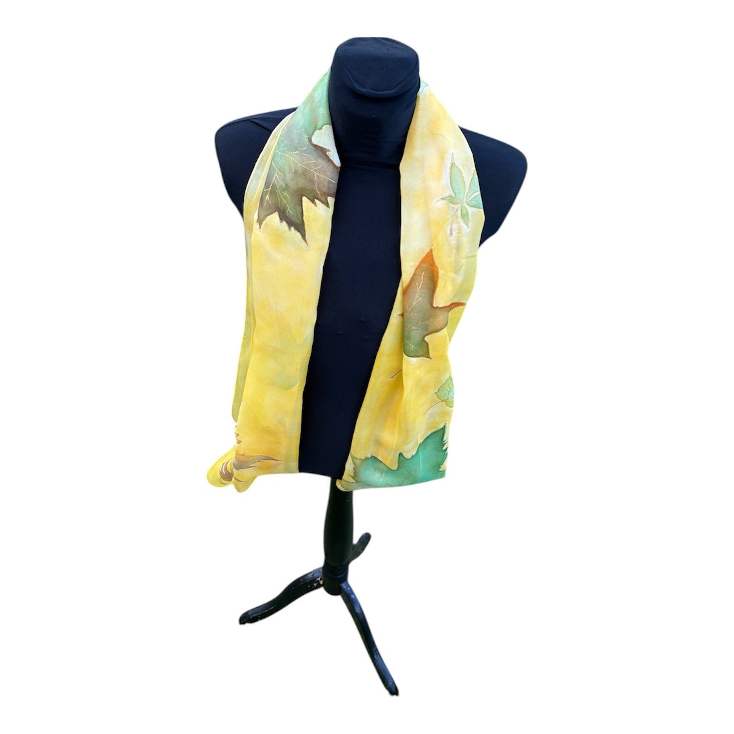 Fular de seda natural amarillo con hojas pintado a mano