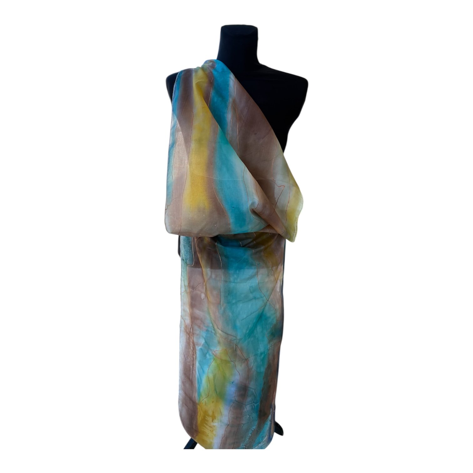 Fular de seda natural marrón y azul, pintado a mano con un proceso totalmente artesanal, el orillado a mano con hilo de seda le da un acabado de alta calidad, no tiene derecho ni revés podrás ponerte de muchas maneras distintas. Regalando este fular regalas la continuación de tu caricia.
