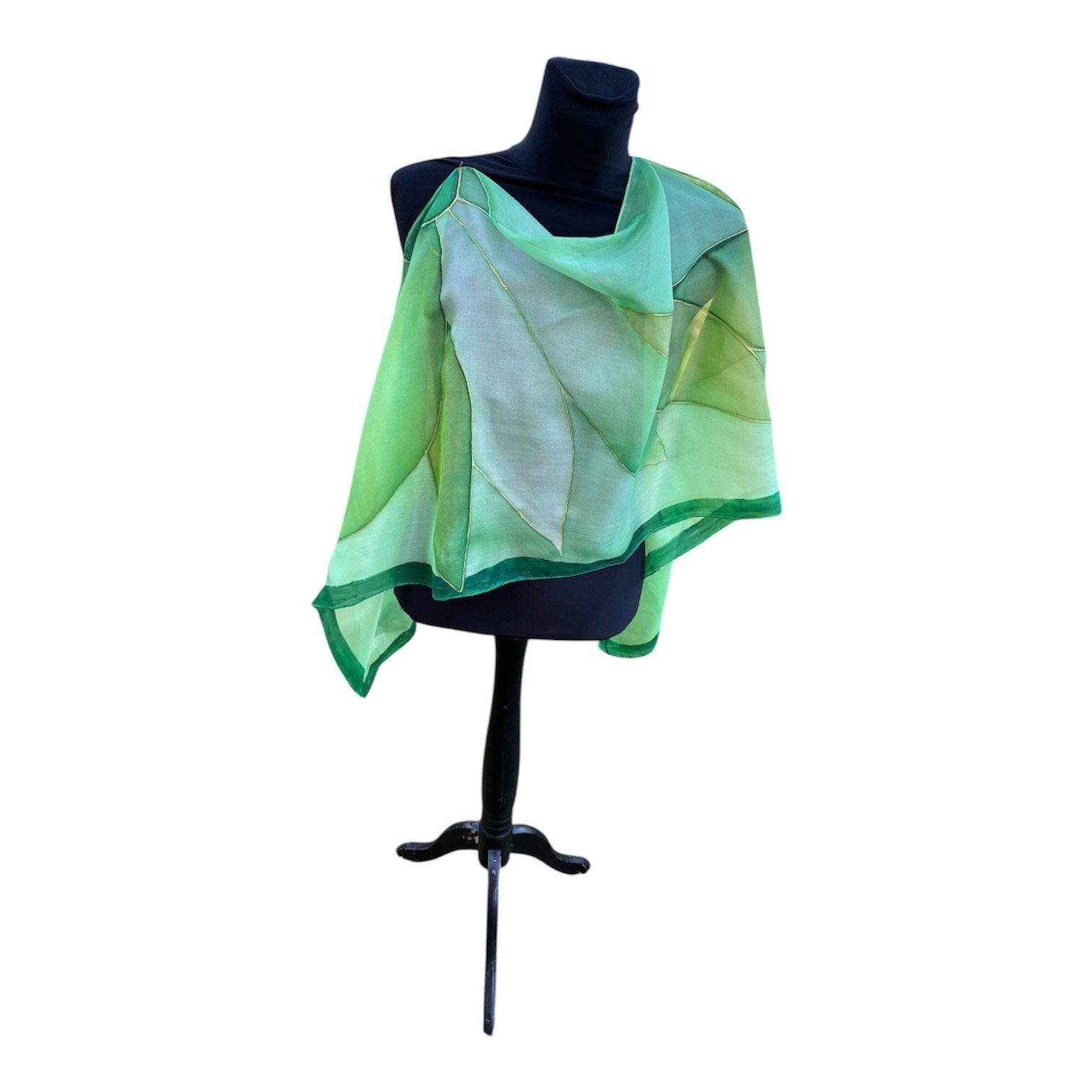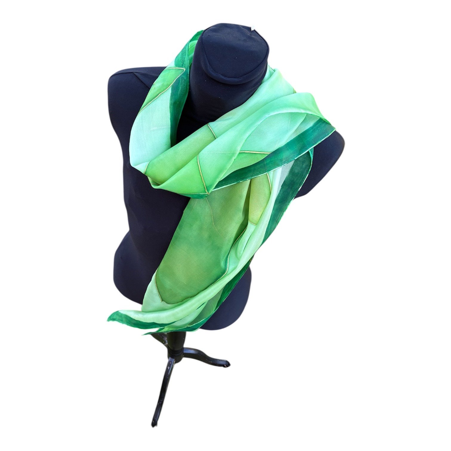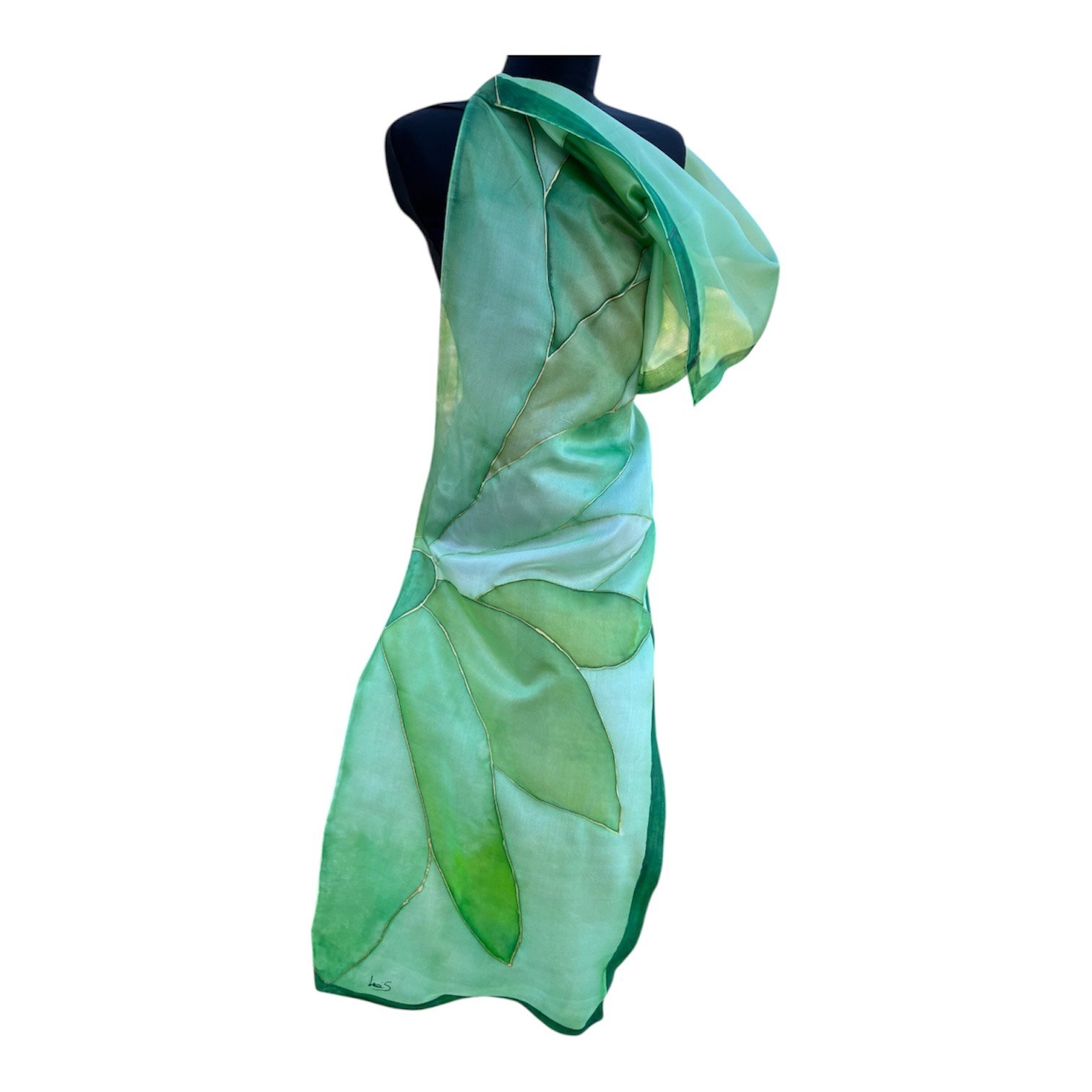 Fular de seda natural con flor en tonalidades verdes, pintado a mano con un proceso totalmente artesanal, el orillado a mano con hilo de seda le da un acabado de alta calidad, no tiene derecho ni revĂ©s podrĂ¡s ponerte de muchas maneras distintas.