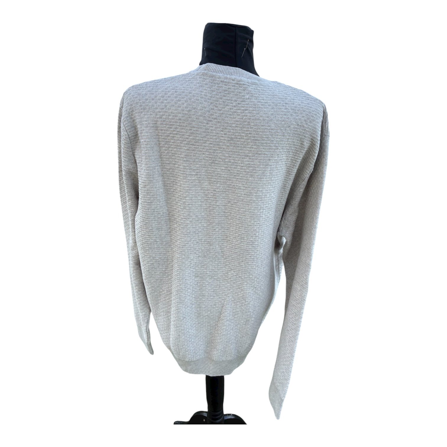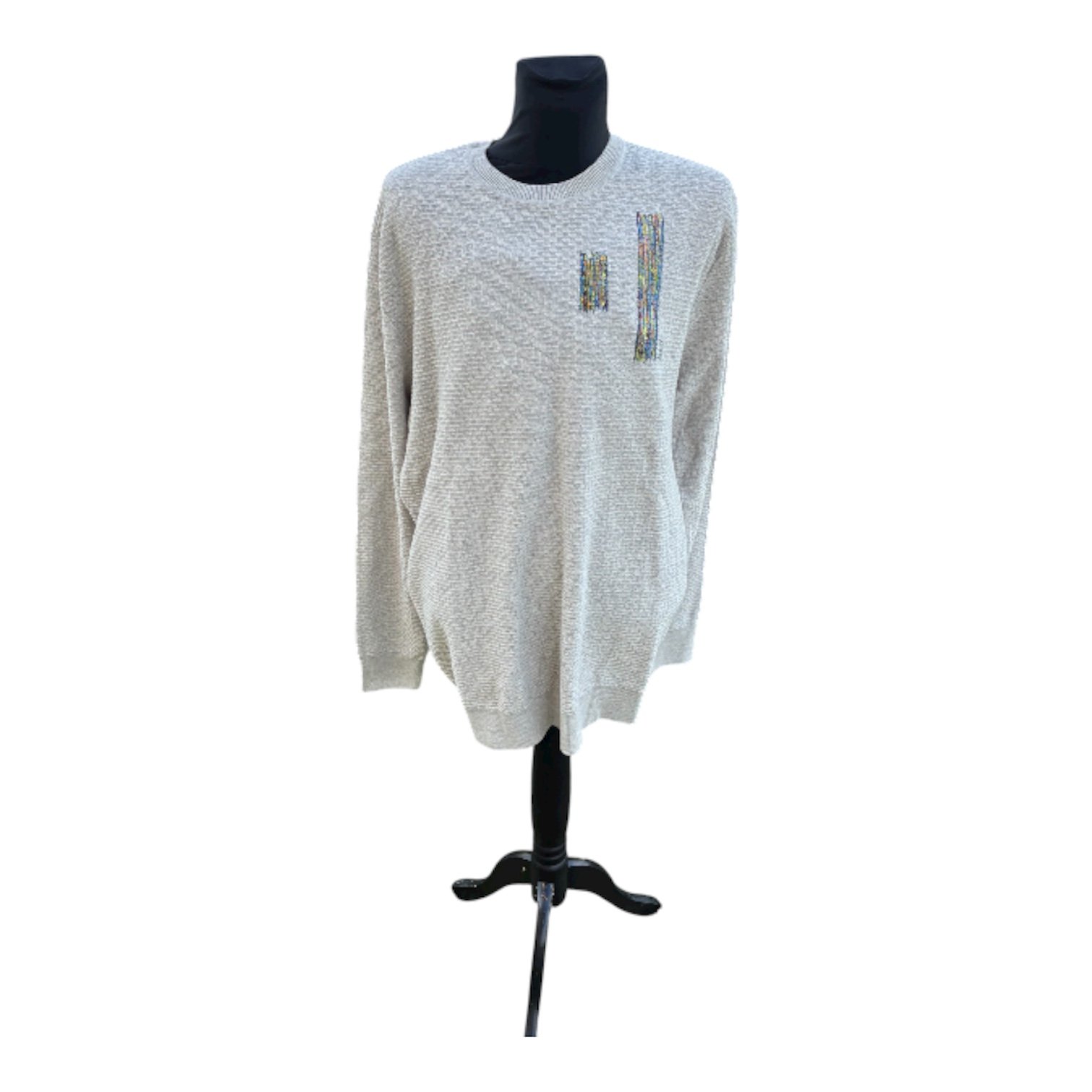 Jersey de punto gris claro, pintado a mano, cuello redondo, manga larga. Medidas: Pecho 61 cm. Largo delantero 77 cm. Largo manga 69 cm. CompsoiciĂ³n 100% algodĂ³n