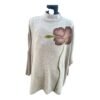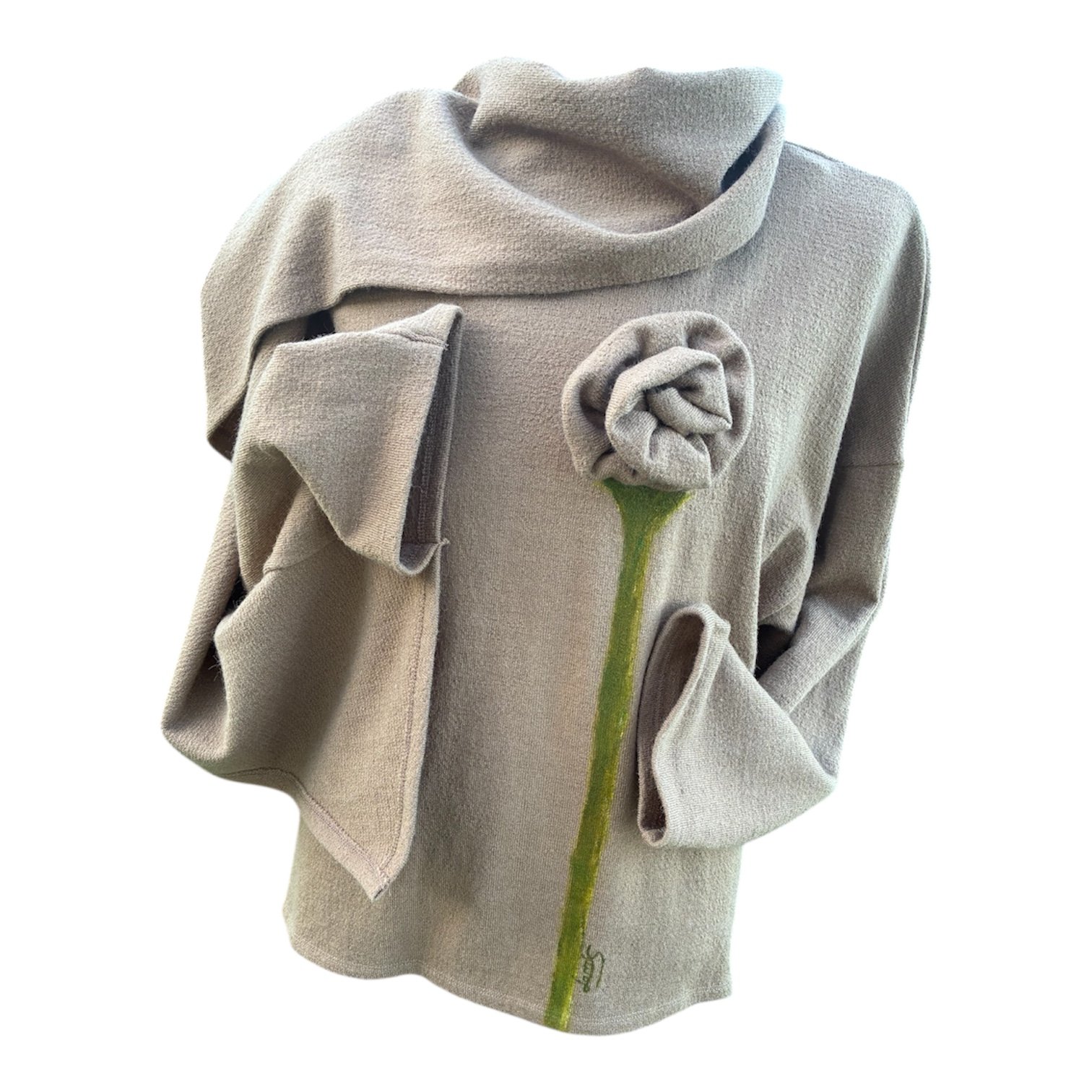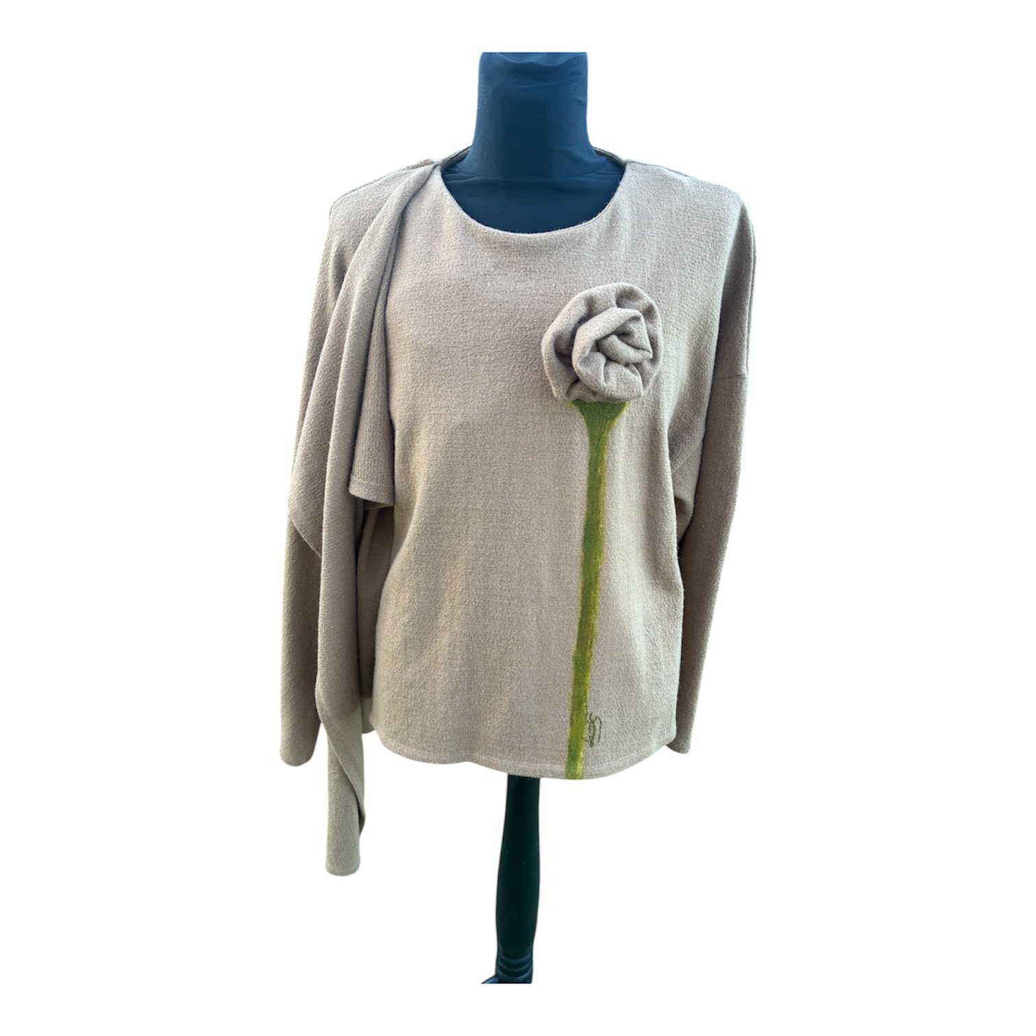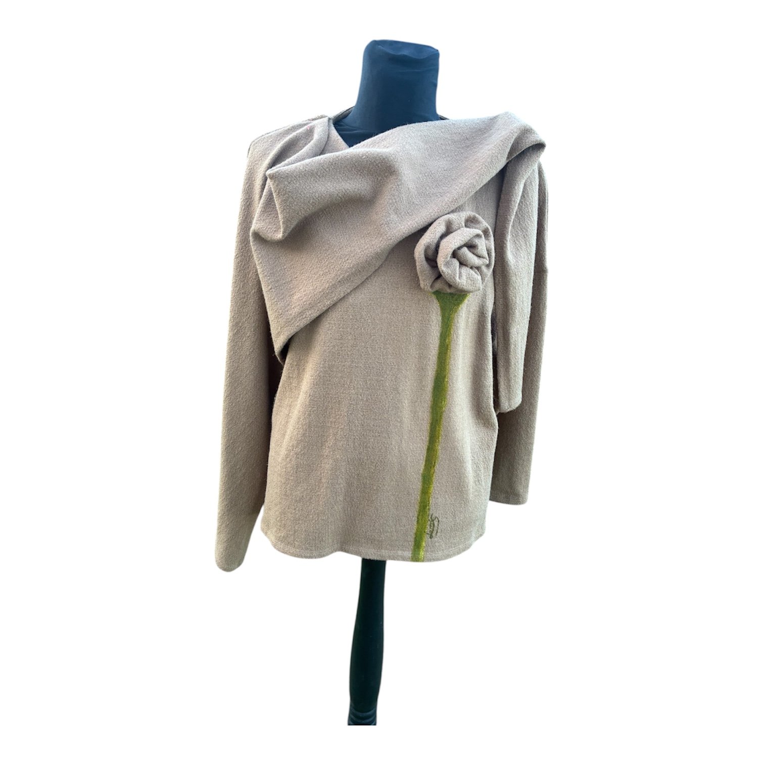 Jersey marrón claro oversize con fular, pintado a mano, flor en relieve, cuello redondo. Precio: 64 euros Talla única S/M/L/XL Medidas: Pecho 61 cm. Largo delantero: 57 cm. Composición: Acrílico 45% Poliéster 32% Poliamida 23%