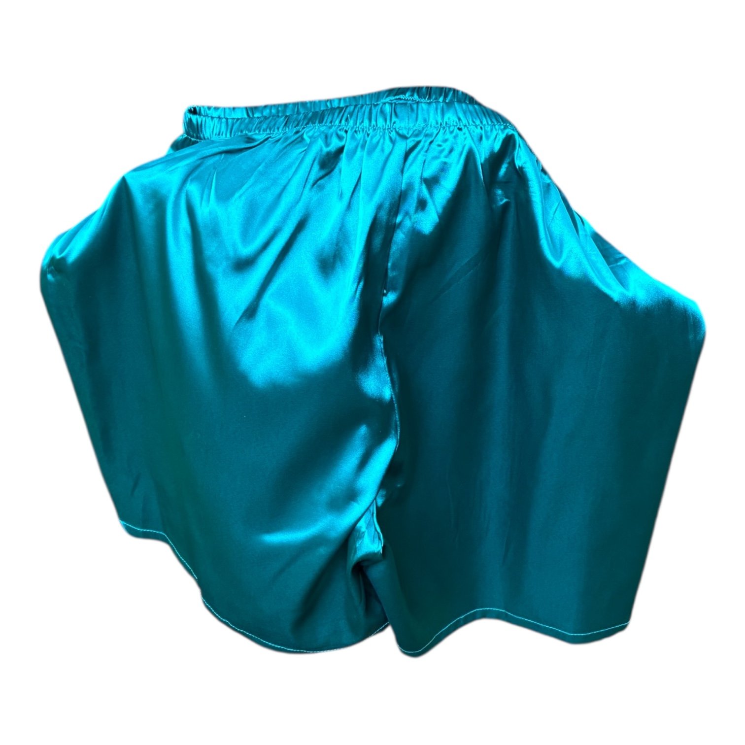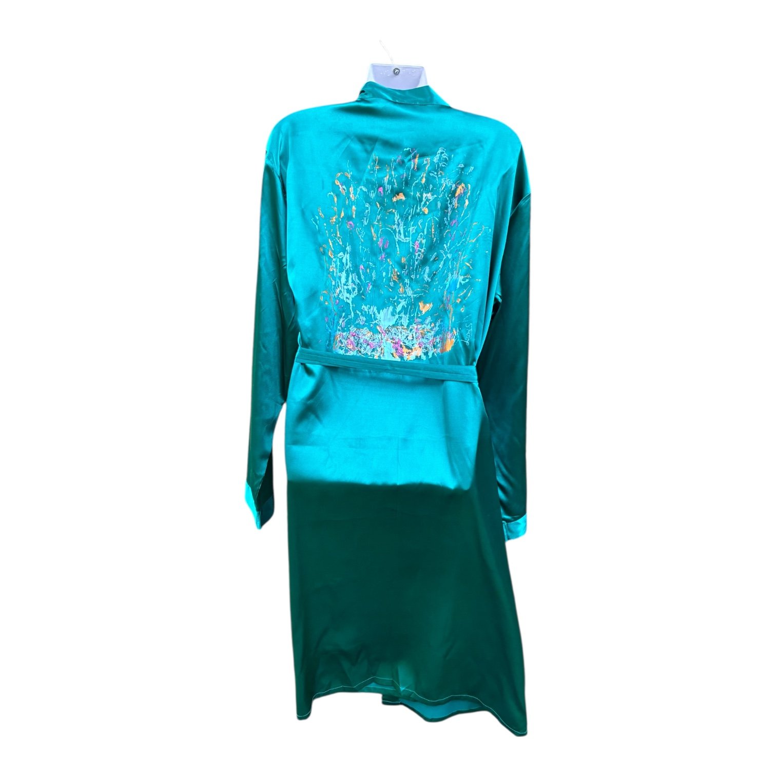 Conjunto de pijama de satén, azul petroleo, pintado en espalda a mano totalmente de forma artesanal, bata con cinturón y pantalón corto con cinturilla elástica, exclusivo, tejido suave y agradable al tacto, brindando una sensación de confort. Composición: Elasteno 5% Poliester 95%