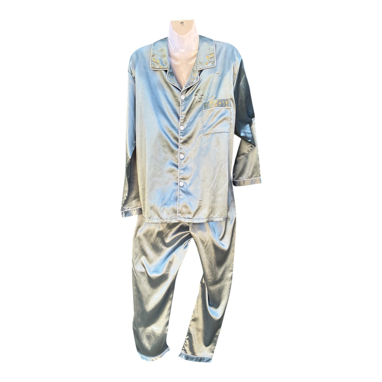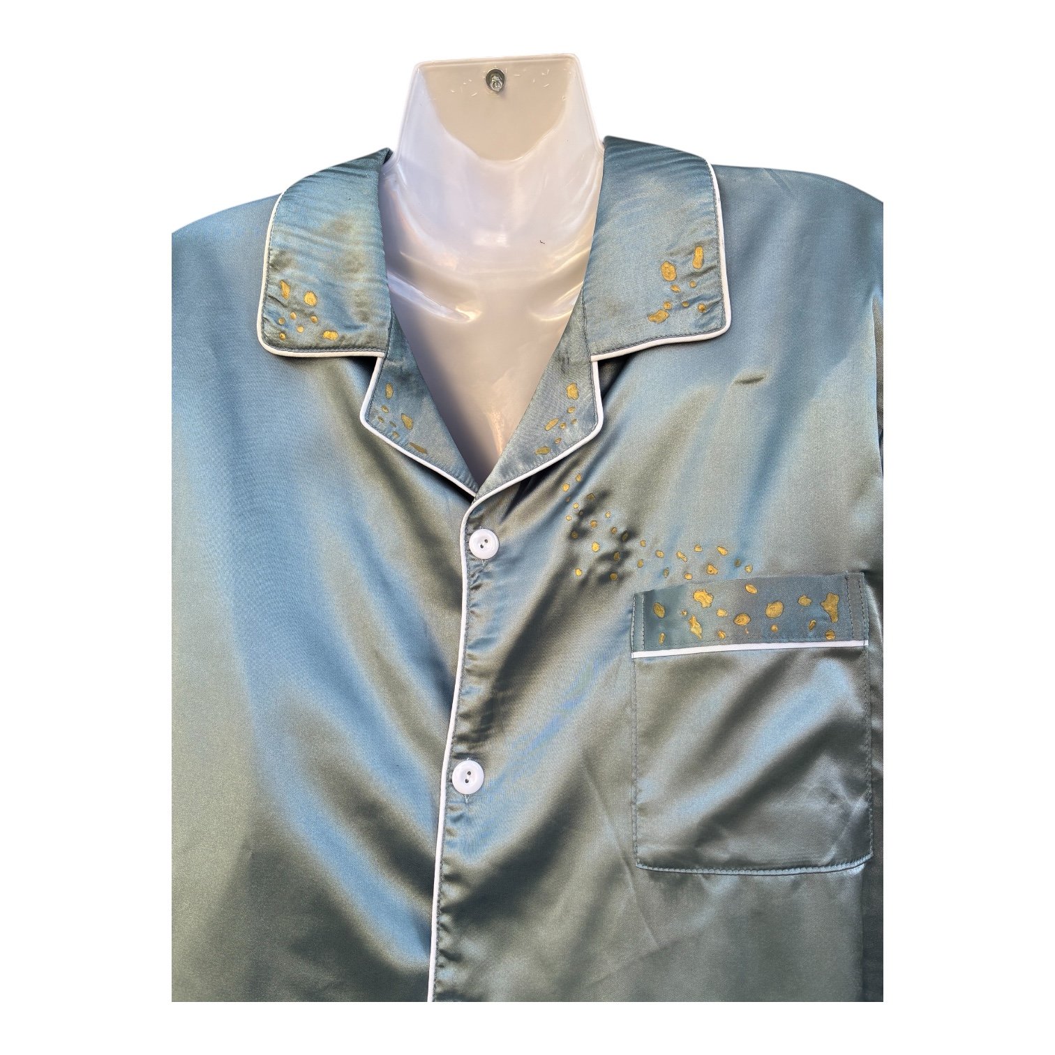 Conjunto pijama satén azul grisáceo, con topos dorados pintados a mano, diseño exclusivo, cuello solapa, manga larga, chaqueta con bolsillo y cierre con botones, pantalón largo con cinturilla elástica, tejido suave y agradable al tacto, brindando una sensación de confort. Medidas: Pecho: 60 cm. Espalda: 47 cm.cLargo manga: 62 cm. Largo delantero: 72 cm. Largo pantalón: 103 cm. Composición: Elasteno 5% Poliester 95%
