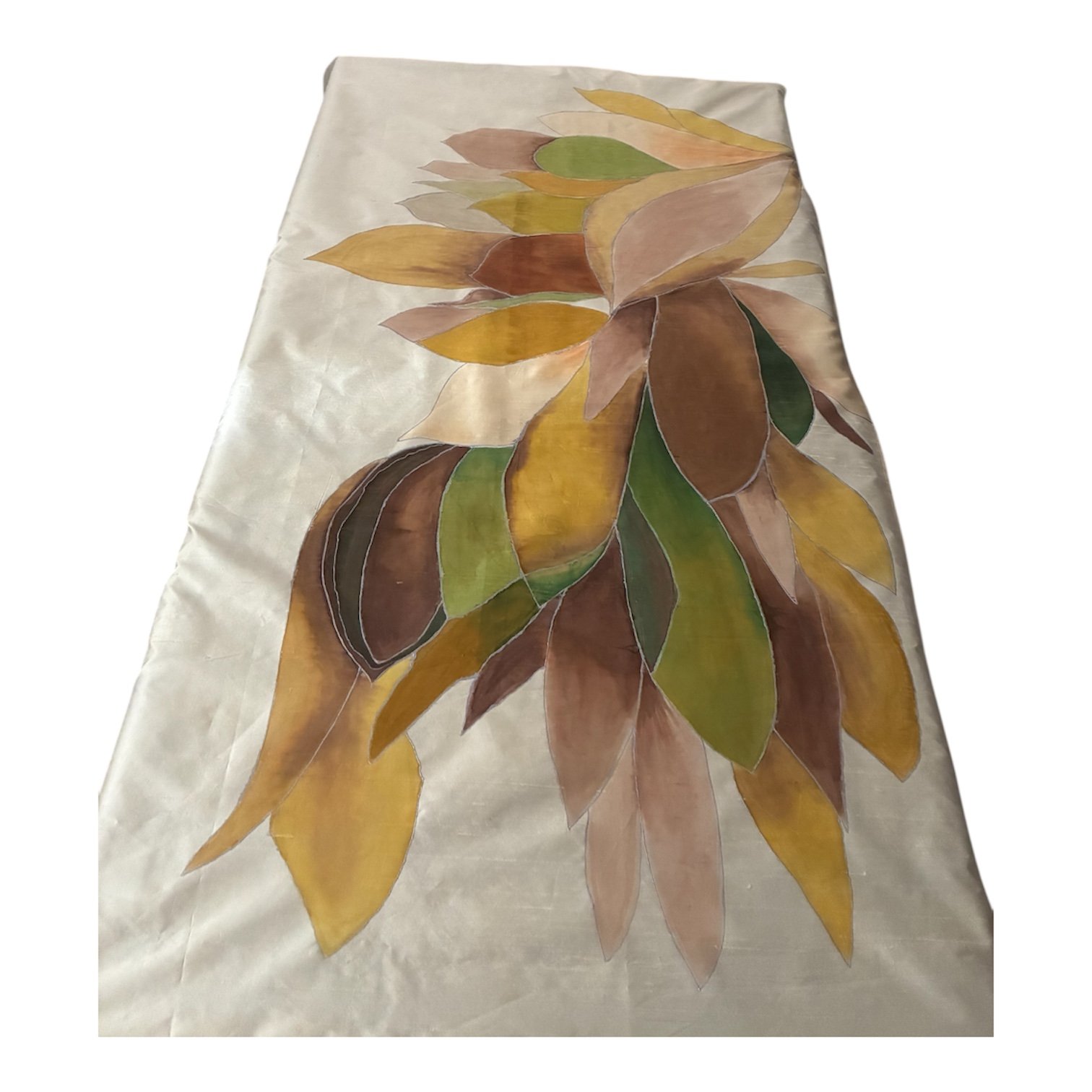 Plaid para los pies de la cama de seda salvaje pintados a mano, exclusivos, lleva a tu dormitorio la suavidad y magnificas propiedades de la seda natural.TambiĂ©n lo puedes utilizar como cabecero, tapiz de pared, etc. Se puede personalizar color y medidas por encargo. Medidas: Plaid 220 x 98 cm. ComposiciĂ³n: Seda salvaje 100%