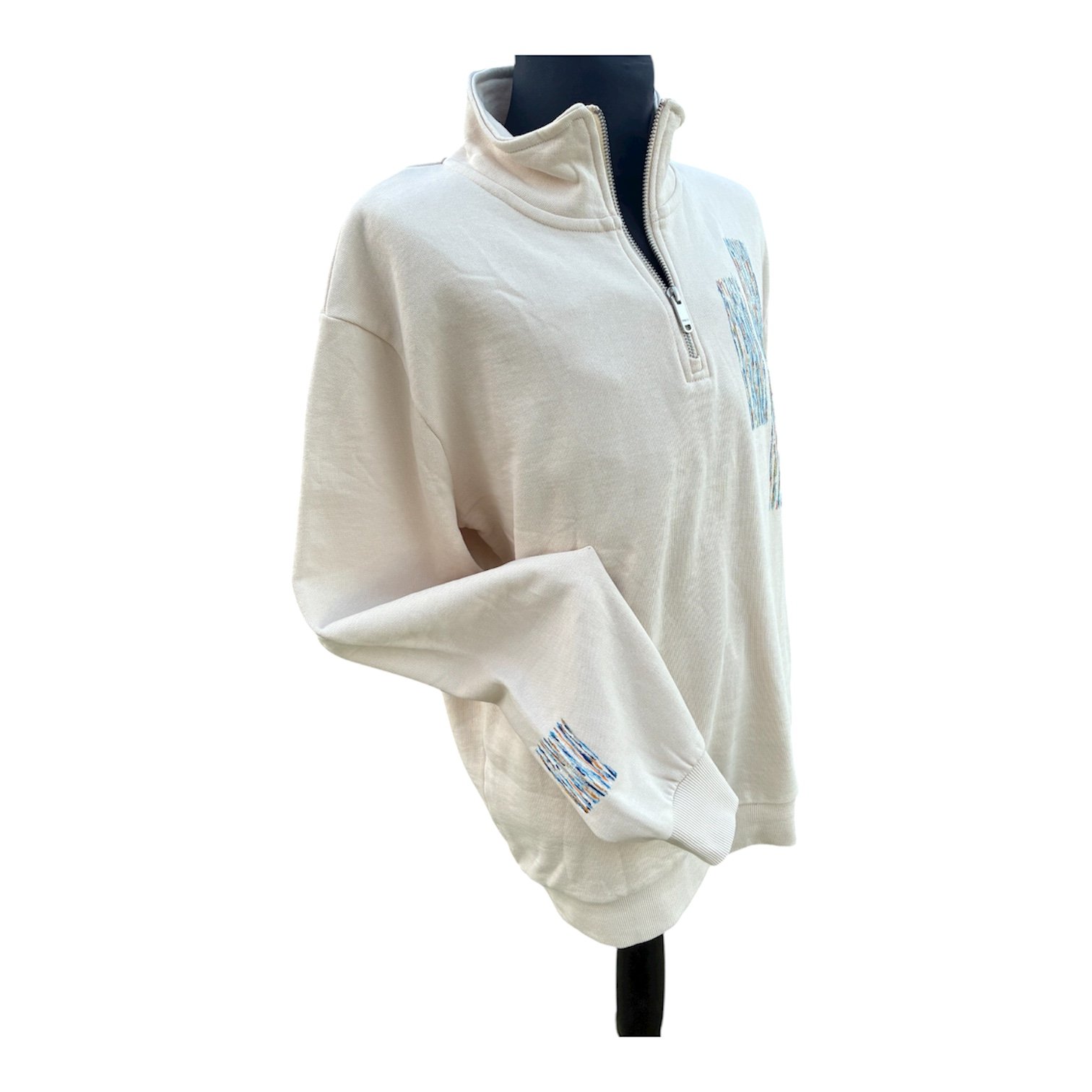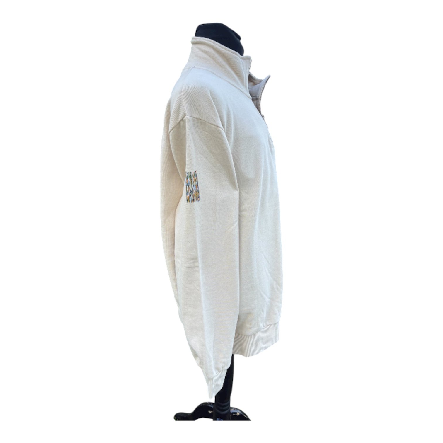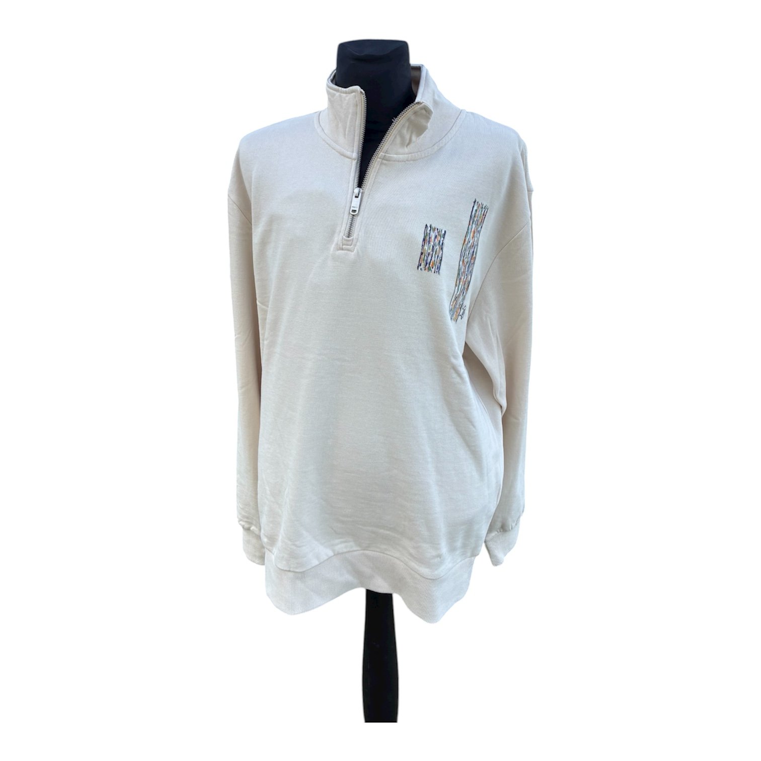 Sudadera beis claro pintada a mano, con cuello alto y cierre cremallera, manga larga. La talla M estĂ¡ pintada con cuatro dibujos en delantero y uno en manga y la talla L con dos dibujos en delantero y uno en manga. Medidas: TALLA L: Pecho: 62 cm. Largo delantero: 72 cm. Largo manga: 67 , TALLA M: Pecho: 57 cm. Largo delantero: 72 cm. Largo manda: 64 cm.