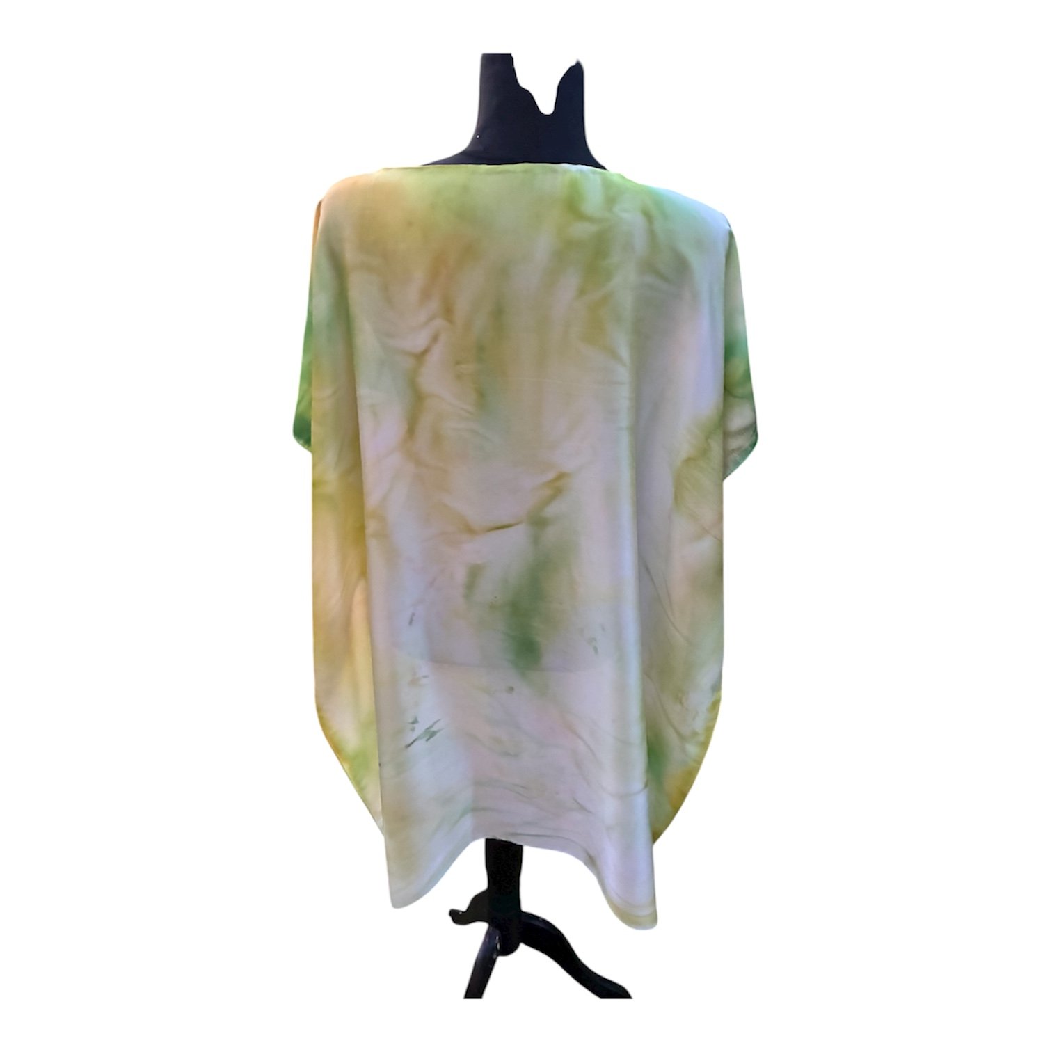 Vestido oversize de seda pintado a mano en un proceso totalmente artesanal, la seda es la caricia más sostenible del mundo, es termorregulador fresca en verano y cálida en invierno, suave, tiene un brillo natural y alta resistencia. Medidas: Contorno pecho: 140 cm. Largo: 91 cm. Composición: Seda 100%. Talla: Única
